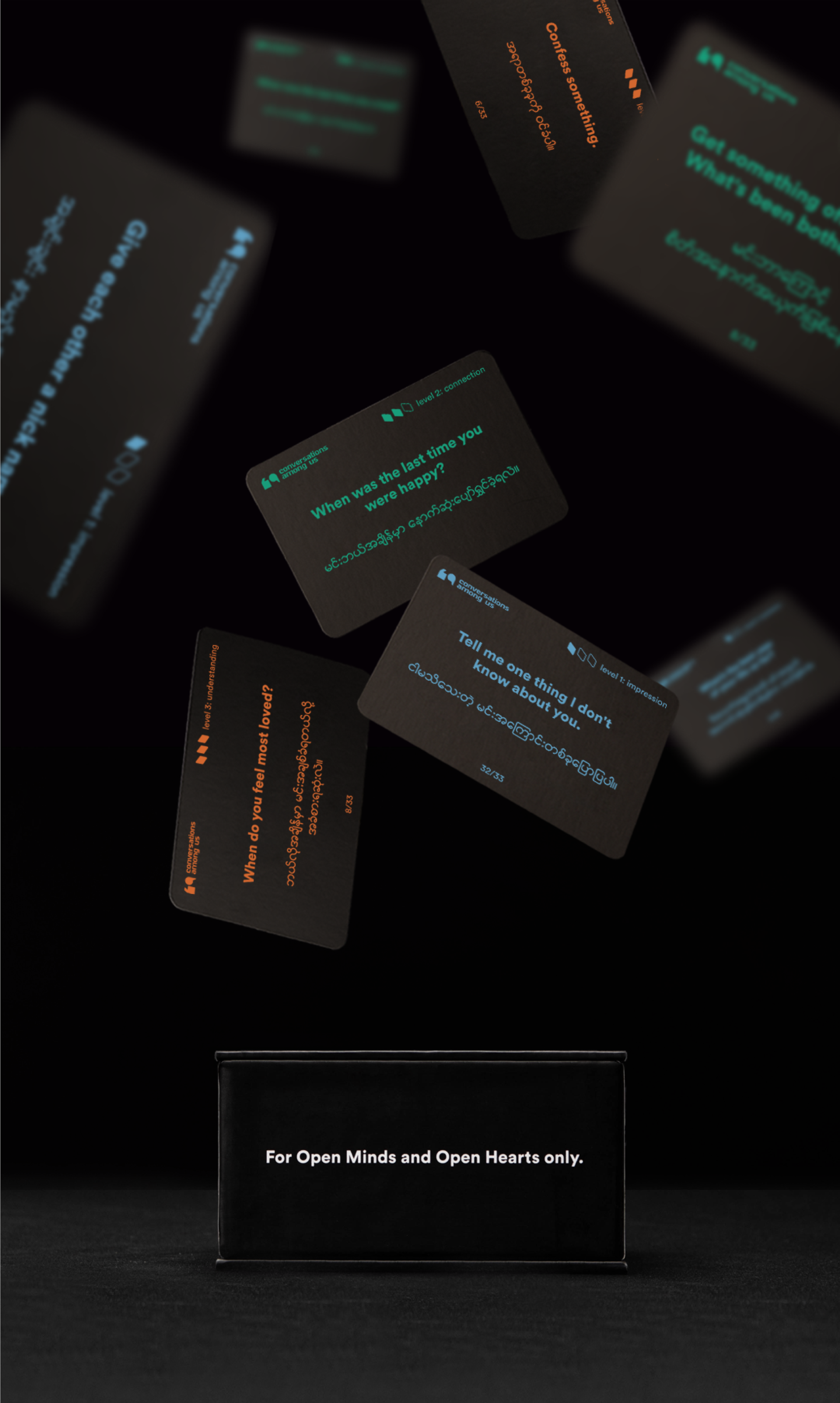To illustrate the three different levels of the game, we have created customized artworks to reflect the visual themes of "First Impressions", "Connection" and "Understanding". The different three colors for each game level also illustrate the spectrum of the emotions of the game as the questions go deeper.